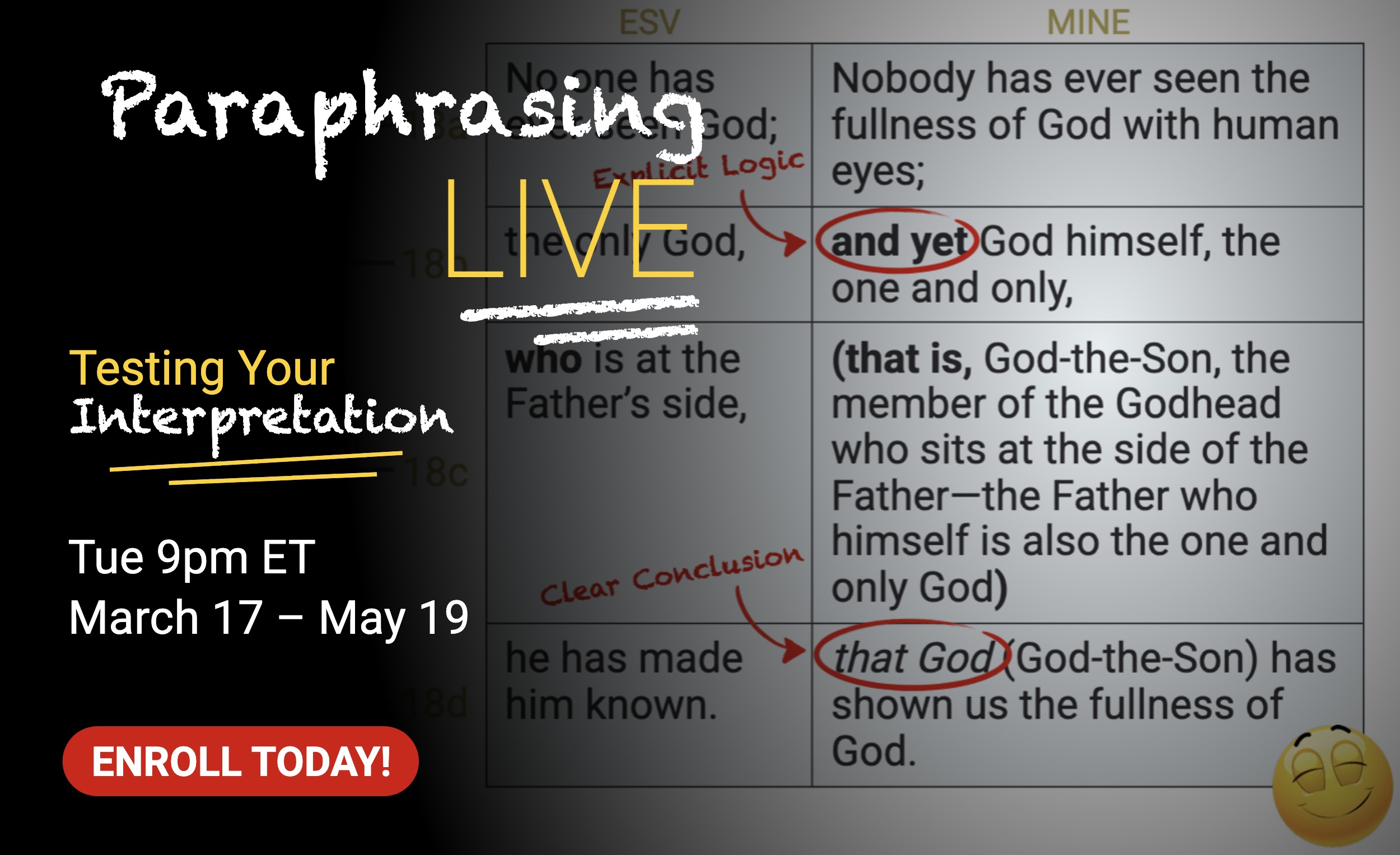 Small groups don’t just study the Bible — they do the Bible together. They wrestle with questions, test interpretations, and learn to articulate what God’s Word clearly teaches. But too often, good conversations stay just that — good — without moving into shared understanding.That’s where Paraphrase LIVE changes the game.Paraphrase gives your group a practical, step-by-step framework for moving from promising observations to sound interpretation. Whether you’re a seasoned leader or new to small group facilitation, the course guides you through interpreting passages in community — exploring options, evaluating them, and building confidence together in what the text actually ...