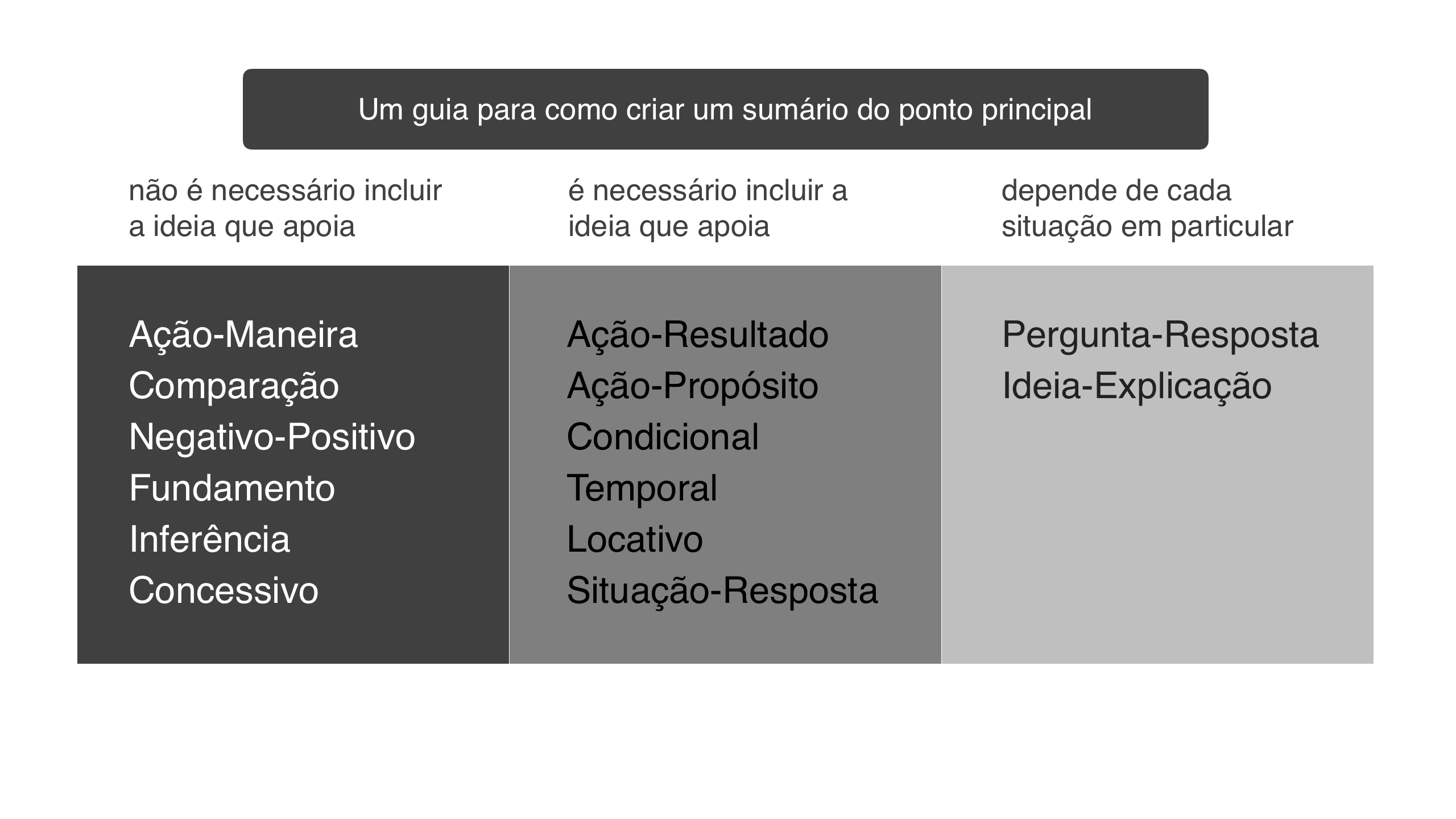 Em última instância, a prática é necessária para se aprender a habilidade de saber quando destacar o ponto principal sozinho, e quando parte das propostas de apoio devem ser trazidas juntamente a fim de capturar a ideia. Então, não se sinta desencorajado se achar esse aspecto desafiador.