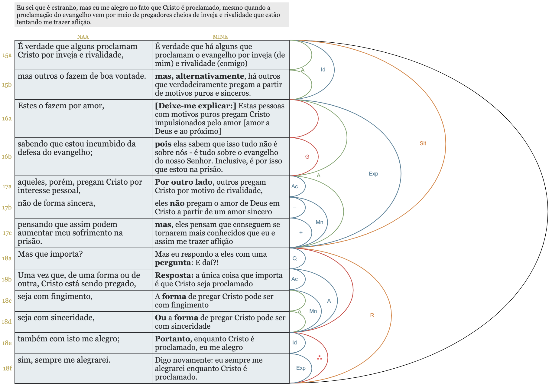Como então podemos determinar o relacionamento correto? Uma forma é descobrir que proposição deve ser o ponto principal, dada arcs de segundo nível e além. Dessa forma, primeiro observamos que (1) Paulo reitera esses dois tipos de pregadores novamente nos versos 16-17 e (2) ele começa a apresentar seu ponto de vista em 18b baseado na presença dos dois tipos. Dadas essas observações, torna-se claro, então que ambas as proposições no verso 15 devem permanecer como seus próprios pontos principais. E dessa forma, nós determinamos que Alternativo deve ser o relacionamento, já que é o único relacionamento Coordenado dentre nossas opções—isto é, é a única opção que torna ambas as proposições em pontos principais separados.