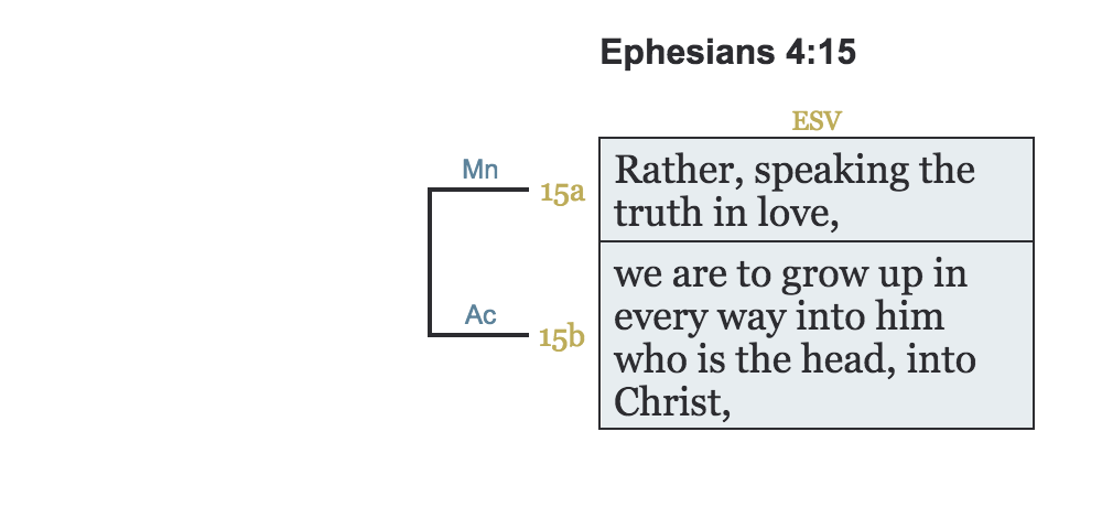 While the concepts of manner and means are not identical, they are related in the fact they both answer the how? question. For this reason, they are both marked Action-Manner in Bracketing and Arcing. In the above examples, 1 Peter 3:5b is a true manner whereas Ephesians 4:15a is a means.