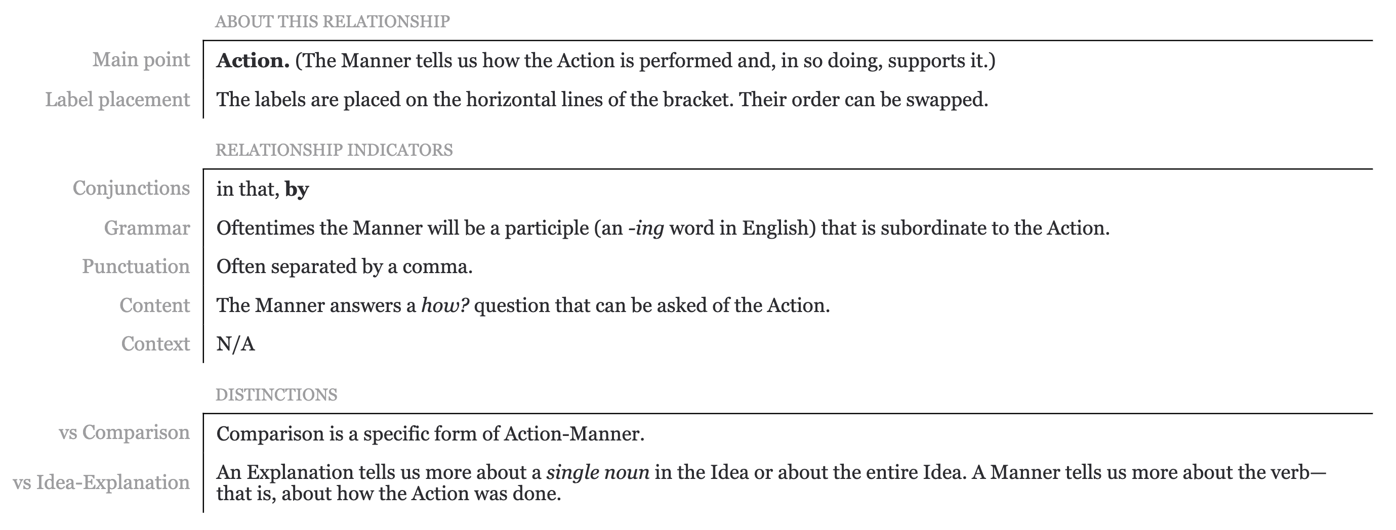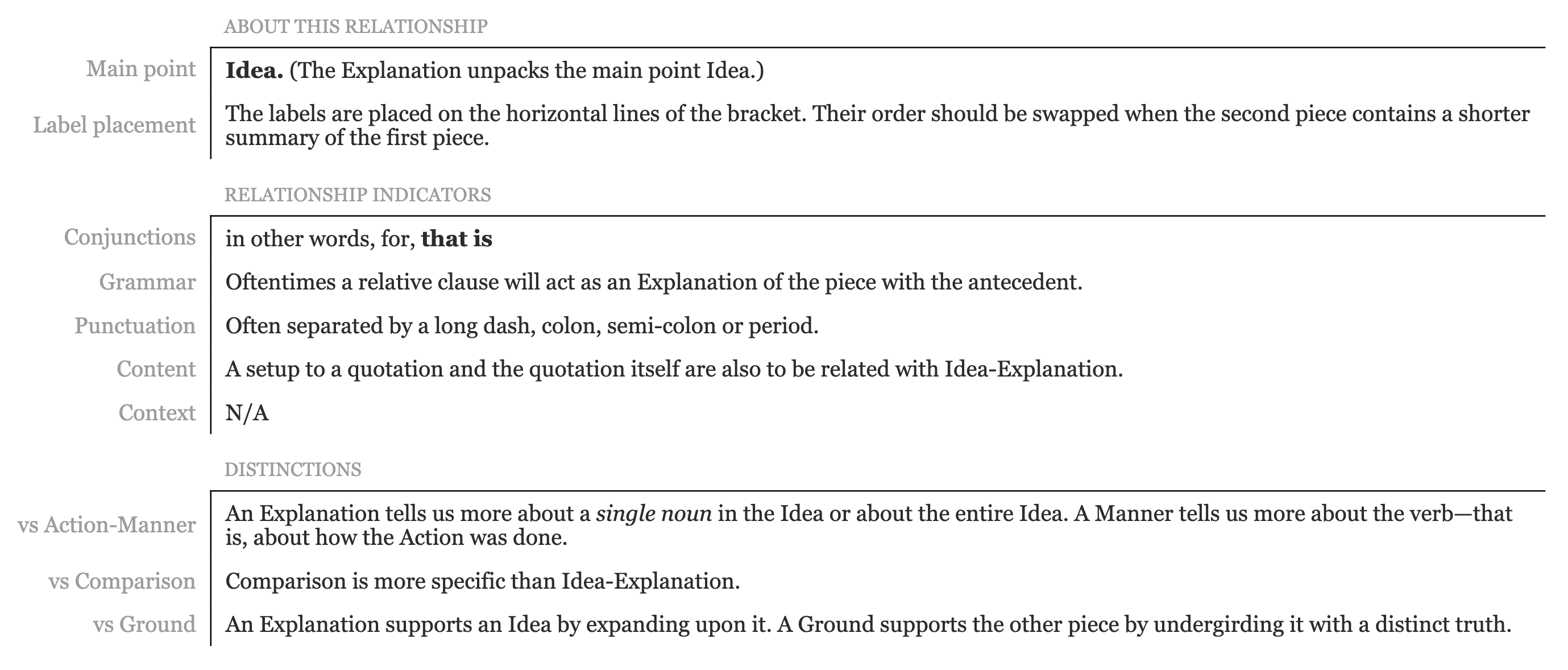 Observe that some Subordinate relationships use two labels (eg. Action-Manner) whereas others use only a single label (eg. Comparison). There is no significance to this. It merely follows from the relationship names.