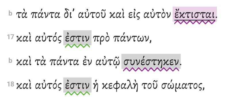 Just as you have been doing throughout Greek II–IV, all finite verbs establish a clause that should be divided on its own. Each of the following lines from Colossians 1:16–18 has a finite verb and forms its own clause.
