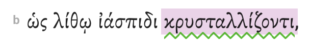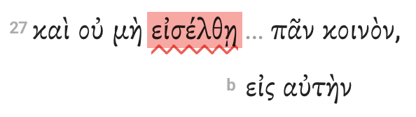 Although the ideal is to keep the word order of the text intact, it is sometimes necessary to extract a phrase or clause from within another clause and place it either above or below the main clause. (See "Extract a phrase" on the "Edit" tab of the Phrasing tool palette.) Here, in Revelation 21:27, a preposition phrase occurs between the verb and its subject. The preposition should be placed on its own line but we want to leave the subject with the verb. We can extract the prepositional phrase and place it below the main clause.