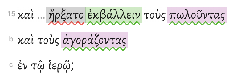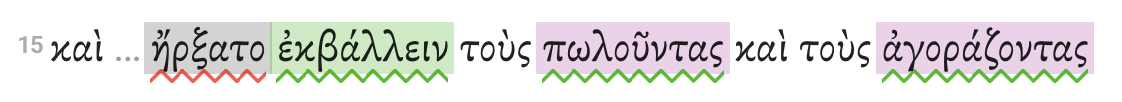 If there are only two items in the list, you may use your own judgment to decide the value of dividing them. Consider the example in Mark 11:15. The infinitive has two accusative, substantival participles standing as direct objects. While you would not split off a simple substantival participle (see adjectival participles above), in this case, you might choose to split off the second participle to highlight the two groups of people Jesus was casting out of the temple.