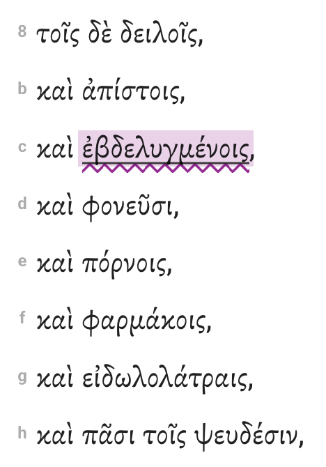 Generally, it is helpful to divide multiple items of a list, even when they are not made up of distinct phrases. For example, in Revelation 21:8, we saw a long list of those whose share is in the lake that burns with fire.