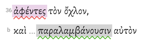For those who have previously taken Biblearc's Phrasing Course, you will be familiar with splitting off genitive phrases. We will not be splitting genitive phrases in this course for two reasons: 1) Doing so would break up the text too much for our purposes, disrupting the natural reading flow; and 2) identifying the various nuances of the Greek genitive typically belongs in an intermediate Greek course. ** Extracting Phrases **