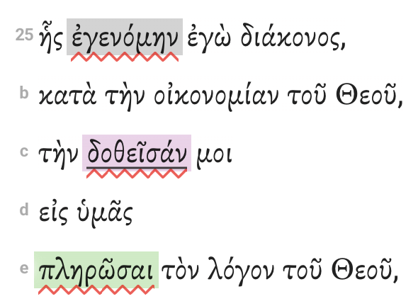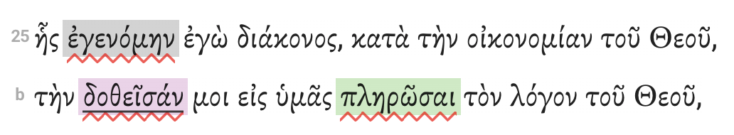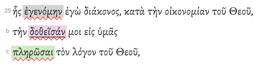 Divide adjectival participles only if they have accompanying modifiers. If the participle stands alone as a bare adjective, leave it with the noun it modifies. Likewise, simple substantival participles should typically not be split off. In Colossians 1:25, the participle τὴν δοθεῖσάν adjectivally modifies τὴν οἰκονομίαν. Since the participle includes a dative indirect object, a prepositional phrase, and an infinitive modifier, we have split the whole unit from the main clause.
