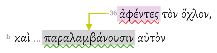 We return once again to the participle in Mark 4:36. The arrow should point to the verb it modifies.