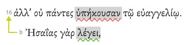 Draw an arrow from subordinate clauses pointing to the first word of the main clause. Here in Romans 10:16, we have added an arrow from the γάρ clause to the main clause it supports.