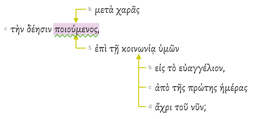 All other modifying phrases (prepositional phrases, adverbial participles, adjectival phrases, infinitive phrases) should have an arrow pointing to the specific word they modify. In the example from Philippians 1:4–5, each prepositional phrase now includes an arrow pointing to the word it modifies.