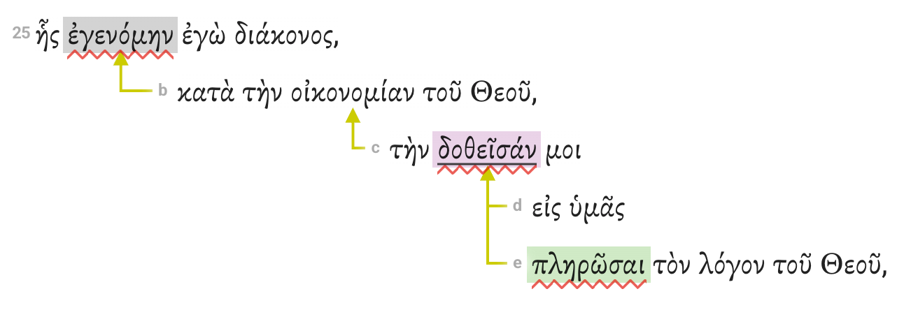 Here in Colossians 1:25, we have added arrows for the prepositional phrases, the adjectival participle phrase and the infinitive phrase.