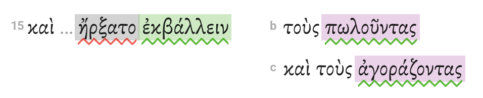 Use the "Indent within lines" tool when you have parallel items in subsequent lines. Such is the case with the two participles in Mark 11:15. In the previous step, we decided to split off the second participle as a short list. The first item should be indented in line and the second indented parallel to the first.