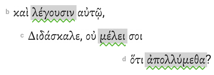 Indent direct discourse (speech content). In Mark 4:38, the disciples speak directly to Jesus. Their speech content is indented from the clause that introduces the discourse.