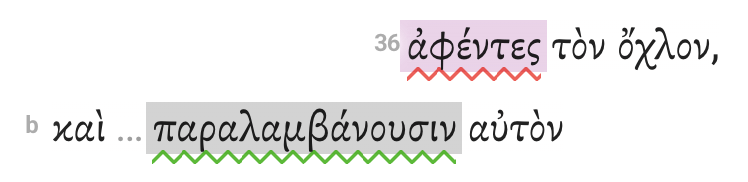 Indent adverbial participles to the right of the main verb of the clause they modify. Here in Mark 4:36, we have indented the adverbial participle which we extracted earlier.