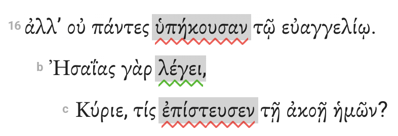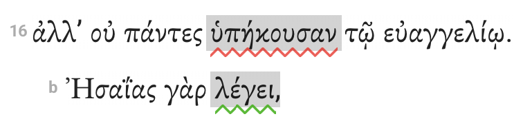 Indent subordinate clauses (including relative clauses) one tab to the right of the clause they modify. In Rom 10:16, Paul will quote Isaiah as support for his assertion. The γάρ clause is subordinate and therefore indented from the main clause.