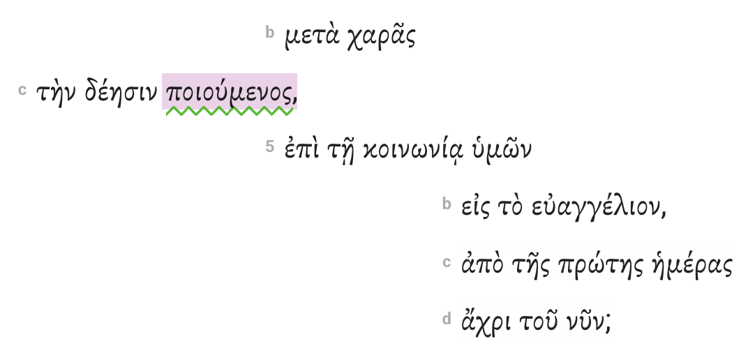 Indent all subordinate phrases to the right of the word they modify. In the following example from Philippians 1:4–5, two prepositional phrases modify the participle ποιούμενος. And then three prepositional phrases modify the noun κοινωνίᾳ.