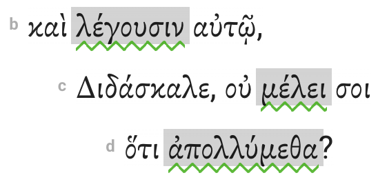 Indent direct discourse (speech content). In Mark 4:38, the disciples speak directly to Jesus. Their speech content is indented from the clause that introduces the discourse.