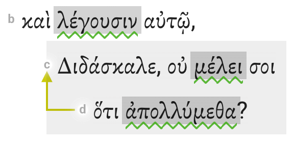 Add a box (in the Arrows+ toolbox) around direct discourse (speech) content and OT quotations. In the first example from Mark 4:38, the disciple's speech content is placed in a box.