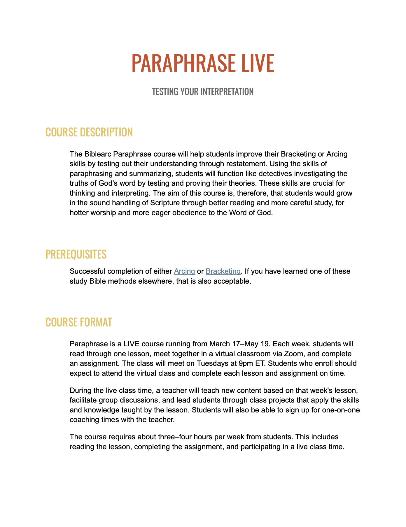 Successful completion of either Arcing or Bracketing. If you have learned one of these study Bible methods elsewhere, that is also acceptable. Meet the LIVE class instructor
