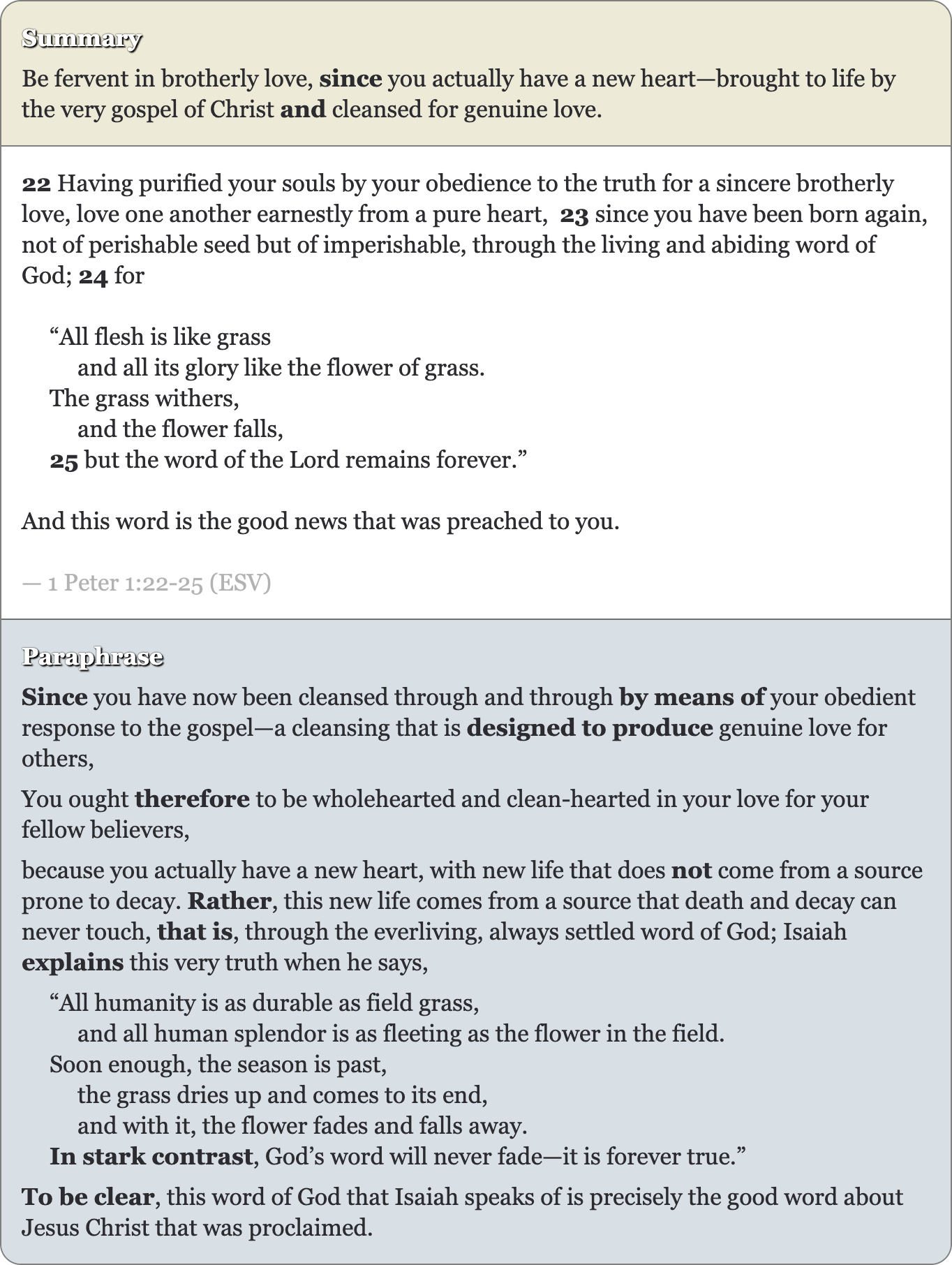Consider the following summary and paraphrase of 1 Peter 1:22-25.