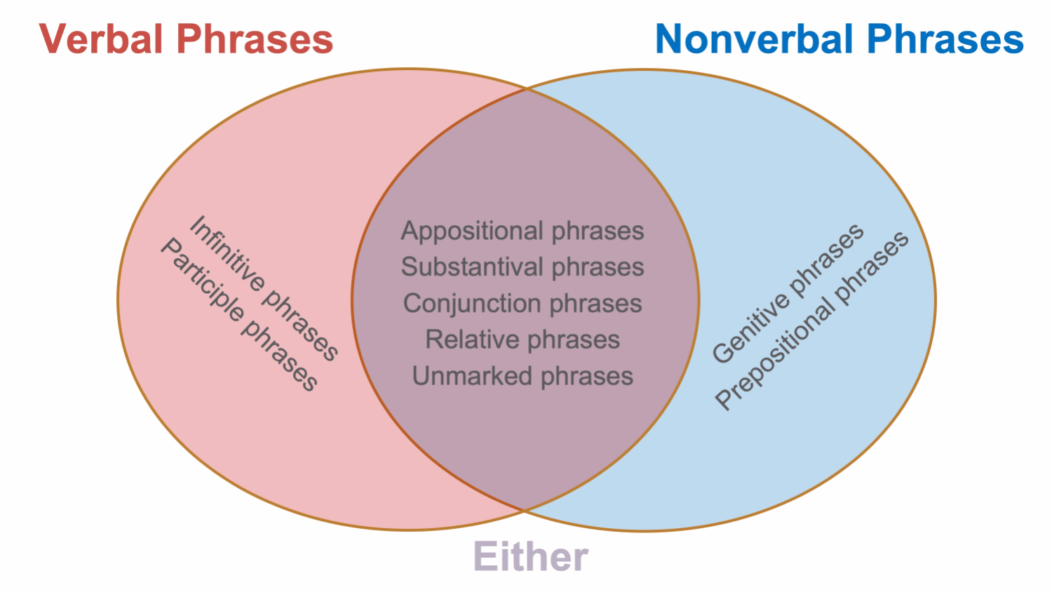 There are some types of phrases which at times have a verb, and other times do not. For instance, conjunction phrases usually do contain verbs, and so I included them in the verbal phrase family in the graphic above. But other types of phrases are always verbal; still others can be either verbal or nonverbal, and some are usually nonverbal. So a more accurate depiction of the two families is seen below: