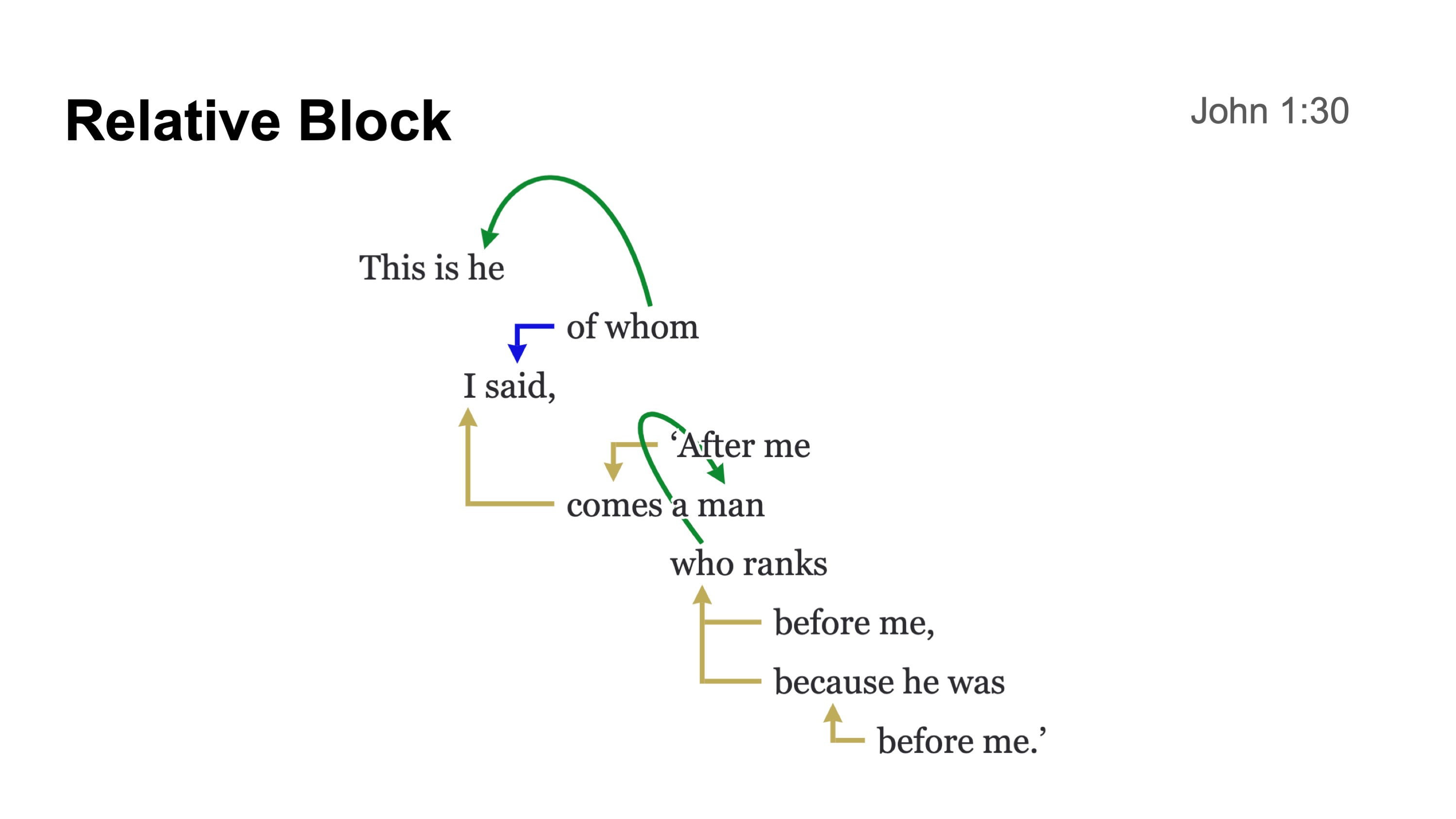 Notice that the phrase within the relative block which contains the relative pronoun (“of whom”) has two arrows. The first is a blue arrow connecting this genitive phrase to its antecedent in the anchor phrase in normal fashion. The second is a curved green arrow from the relative pronoun to its antecedent. This is the connection point between the relative block and its anchor phrase, “This is he”. On the other hand, the head phrase of the relative block has no arrow, because the connection between the relative block and its anchor phrase has already been made.