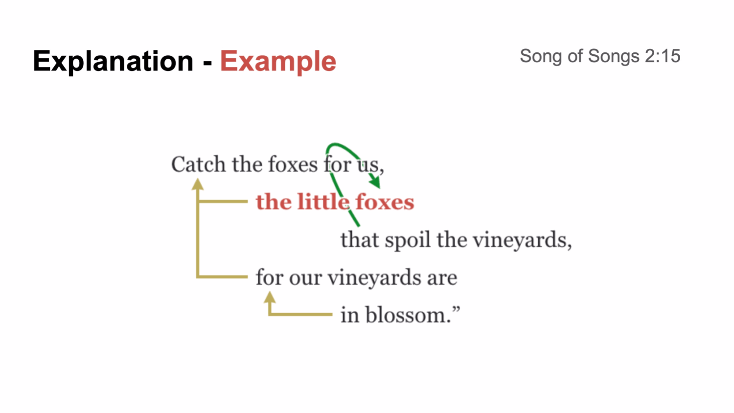 A specific example of the kind of foxes that the married couple in the Song are trying to catch are little foxes who spoil vineyards.