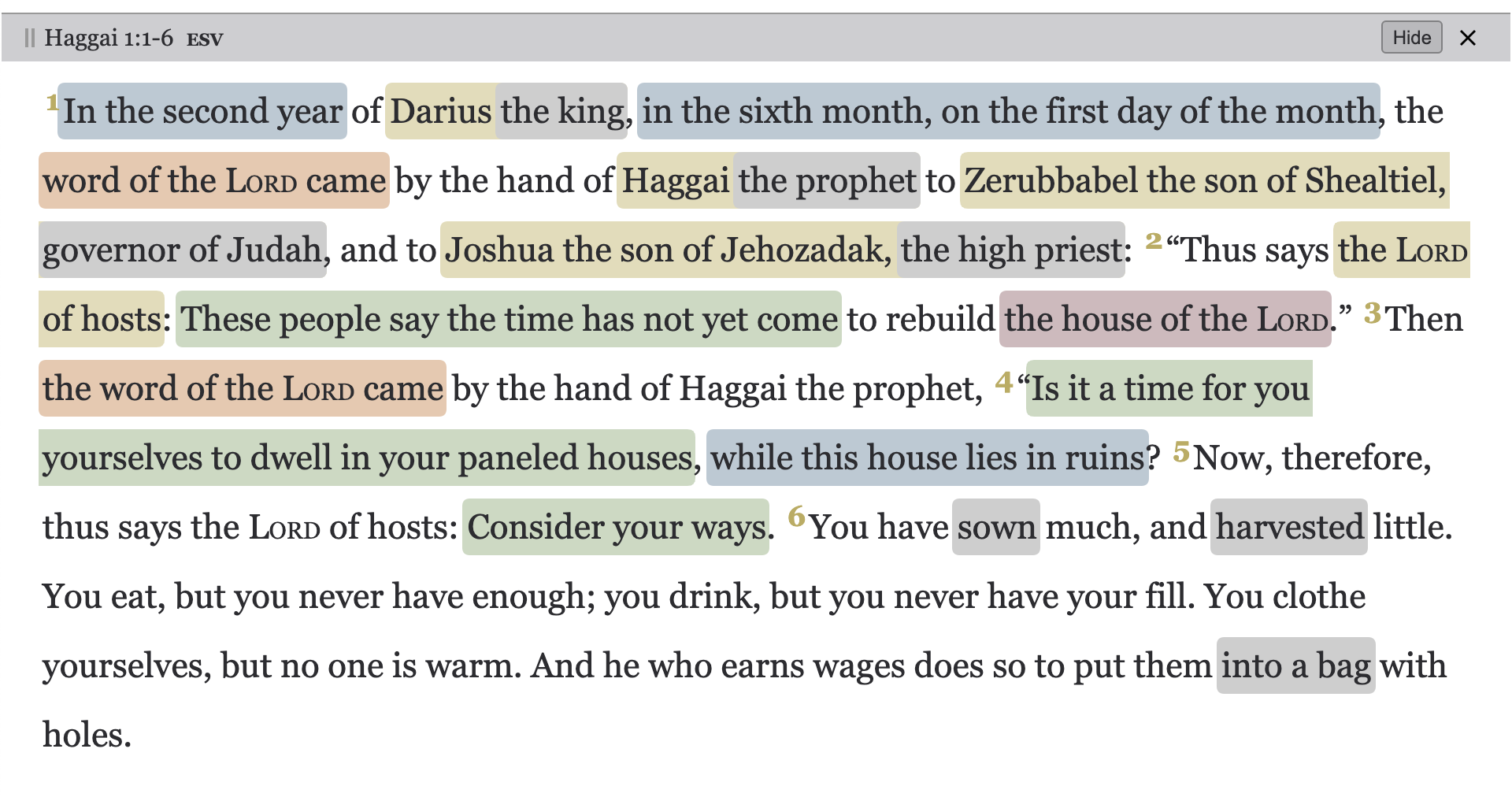 "The LORD of hosts": "This name for God will appear consistently in both Haggai and Zechariah. 'Lord' (Heb. yhwh) is the name of God revealed to the Israelites through Moses as he entered into covenant with this people (Ex. 3:14–15; 6:2–3; 33:19; 34:6–7). 'Almighty' (or 'of hosts'; Heb. ṣebaʾot) is a name suggesting war, since it is used to speak of an organized army unit (Judg. 8:6; 9:29) as well as of a group of heavenly beings as God’s armies (Josh. 5:14–15; 1 Kings 22:19). However, the consistent use of this word in prophetic material in general and the Persian period prophetic books in particular reveals that this name for God has lost all connection with the context of war and is a name that speaks mainly of the might and power of God" (Boda, Haggai, Zechariah, 88).